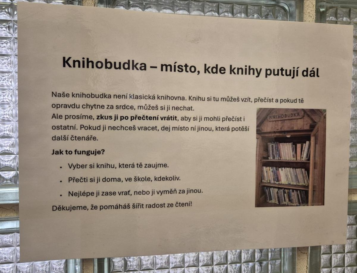 rádi bychom Vás informovali o novince, kterou jsme zavedli na 2. stupni naší základní školy. Touto novinkou je knihobudka. Knihobudka není klasická knihovna. Děti si z ní mohou kdykoliv vybrat knihu, přečíst si ji doma, ve škole nebo kdekoliv jinde. Pokud je kniha opravdu zaujme, mohou si ji ponechat. Ideálně ji ale po přečtení vrátí, aby si ji mohli přečíst i další spolužáci, případně ji mohou vyměnit za jinou z vlastních zdrojů – takovou, která potěší další čtenáře.