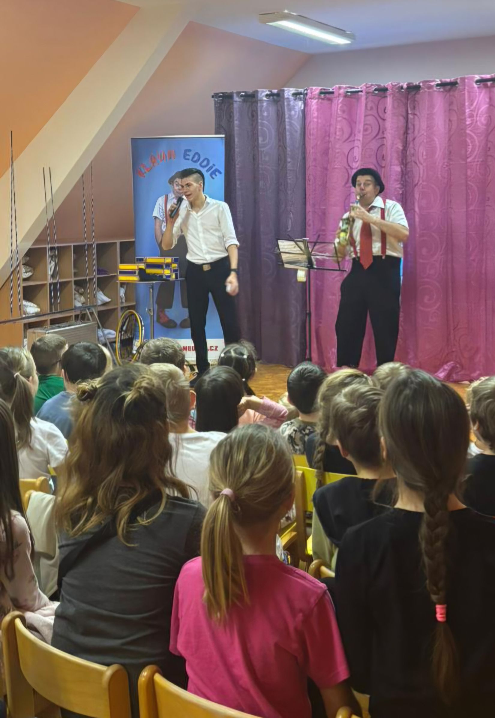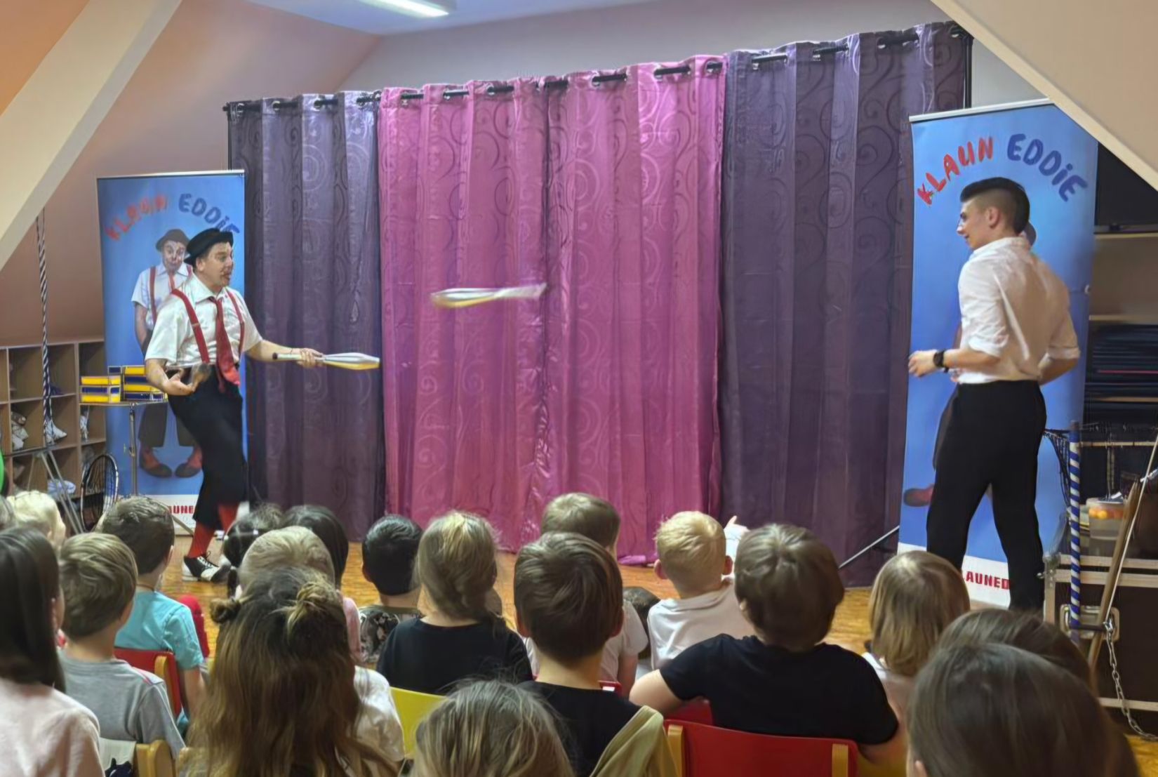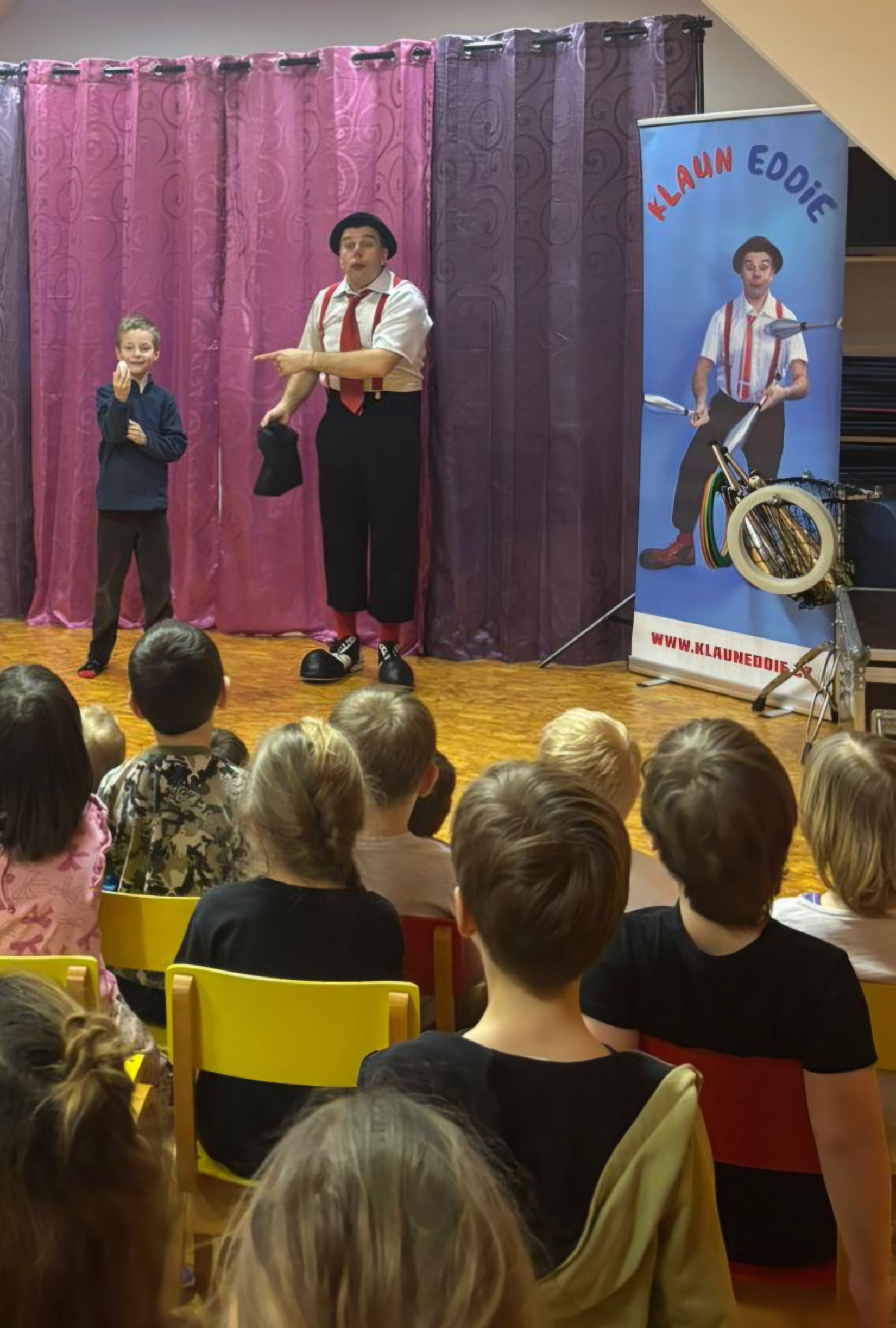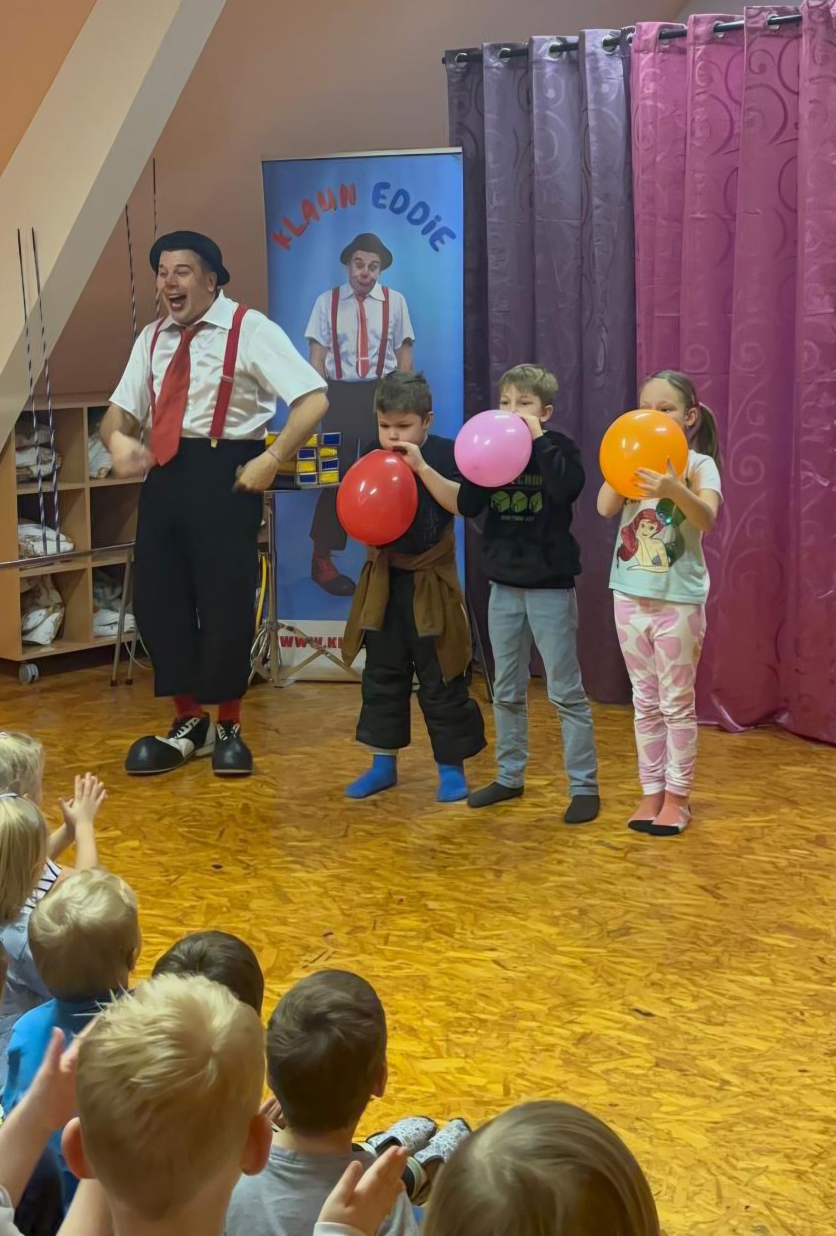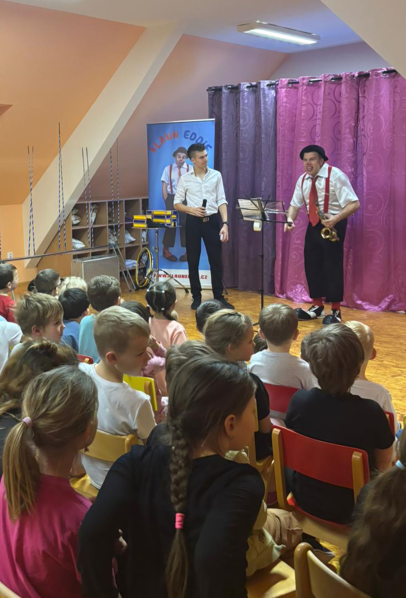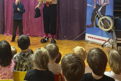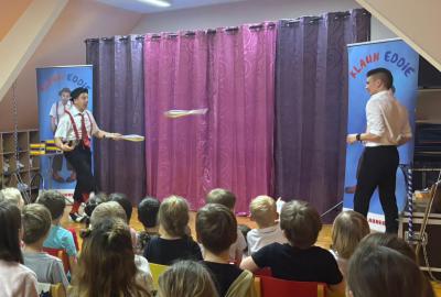 Ve čtvrtek 15. 1. 2026 jsme navštívili MŠ v Litni, abychom zhlédli program, který si pro nás připravil klaun Eddie. Představení bylo hodně podobné jako vloni, ale nám to nevadilo. Byla to veliká zábava, smáli jsme se od začátku až do konce. Viděli jsme hudební klauniádu, která obsahovala hru na různé dechové hudební nástroje. Unikátní byla hra na dvě trubky současně. S tou je klaun Eddie (pan Eduard Janeček) zapsán v české knize rekordů. Do programu byla dále zařazena žonglérská show, vystoupení s rotujícími talíři, různá kouzla a soutěže. Do vystoupení byly zapojeny i děti. V soutěži, kdo nafoukne největší balonek, vyhrála Eliška. Získala žirafu vytvořenou také z balonku. Moc děkujeme MŠ Liteň za milé pozvání.