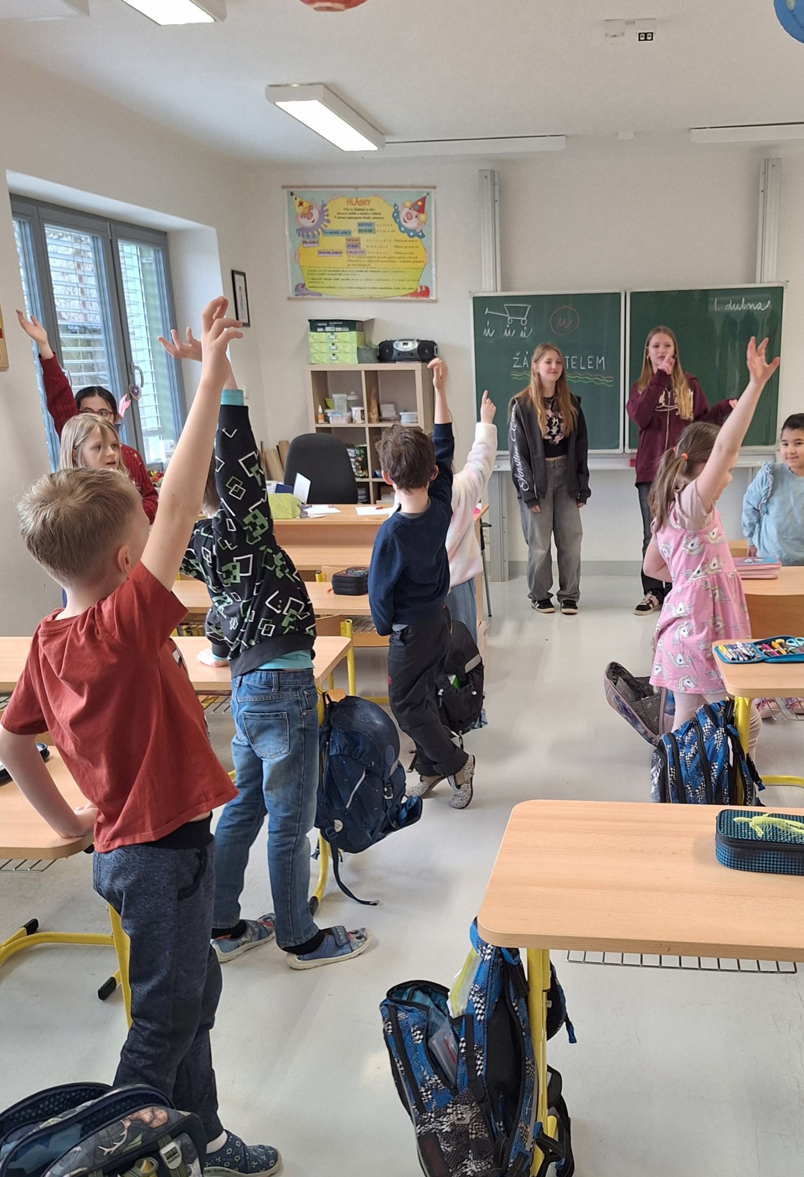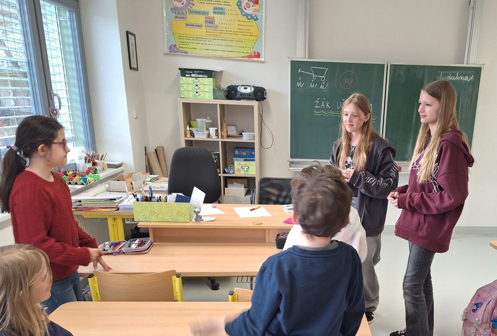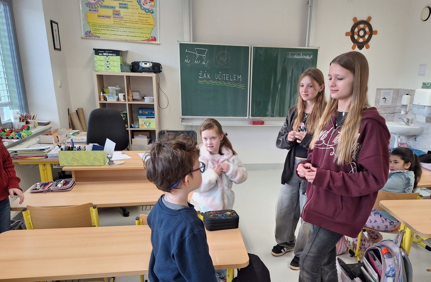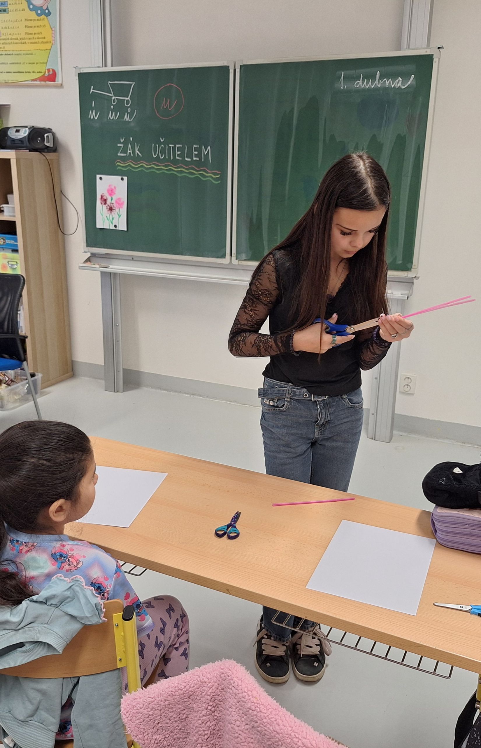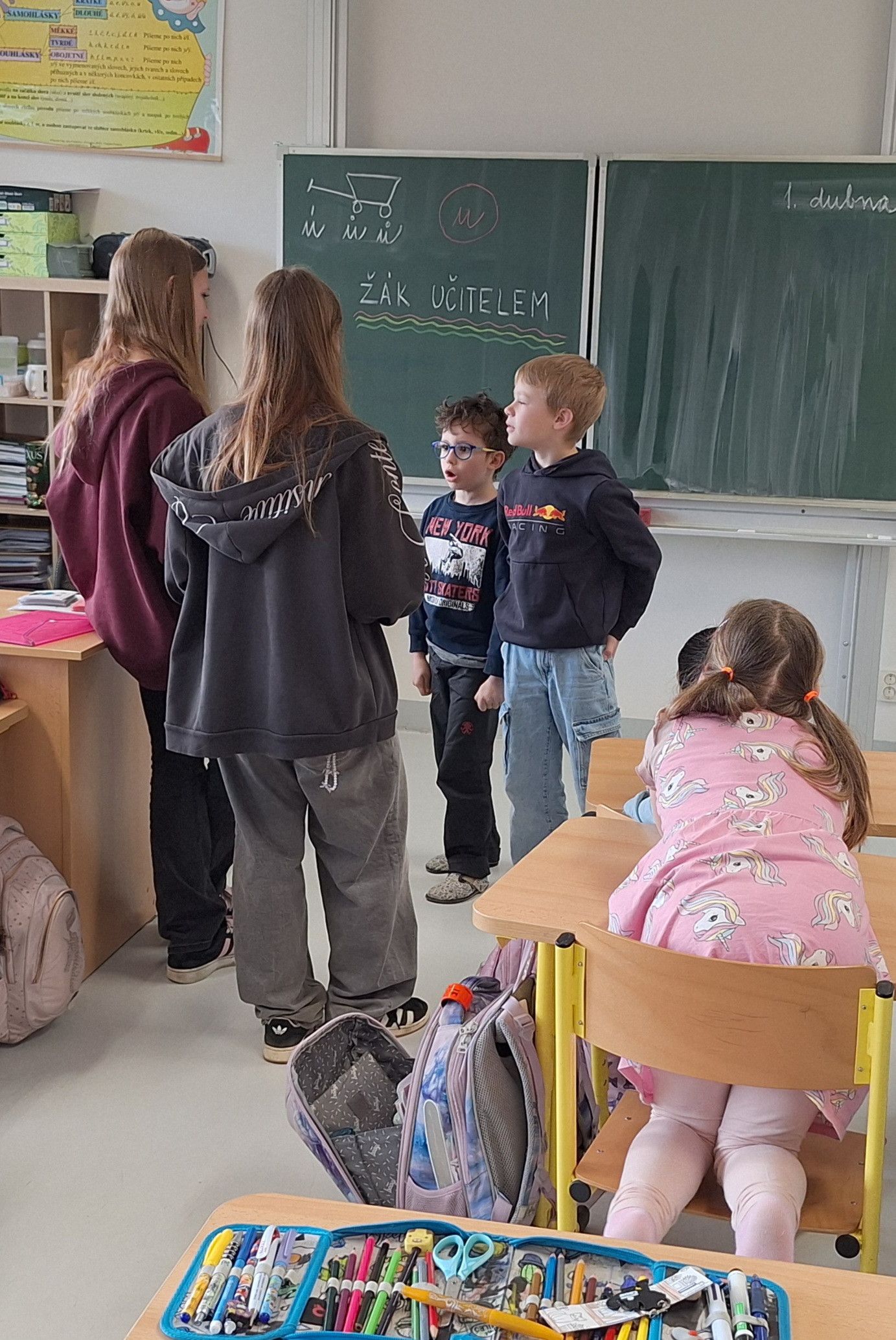 Ve středu 1. 4. 2026 se na naší škole konal projekt "Žák učitelem". V naší třídě se vystřídalo 6 milých "učitelek". První hodinu si připravily Kačka s Natálkou z 8. třídy. Byla to hodina matematiky plná her. Děti byly nadšené. Celou hodinu byly pozorné a hodné. Jedna z her se jim zalíbila natolik, že ji hrály i o přestávce. Určitě ji zařadíme i do našich hodin. Druhá hodina probíhala pod vedením Darinky a Emilky - opět žákyň z 8. třídy. Žáci pomocí otisku nastříhaných plastových brček "vykouzlili" nádherné kytice. Poslední dvě hodiny byly plné akce a napětí. Samantha a Nela z 9.A si pro nás připravily pod vedením paní zástupkyně Renaty Klimešové několik pokusů. Byly úžasné ("paní učitelky" i pokusy). Všem děvčatům moc děkujeme za skvěle připravené hodiny. Už nyní se těšíme na příští školní rok a tuto akci.
