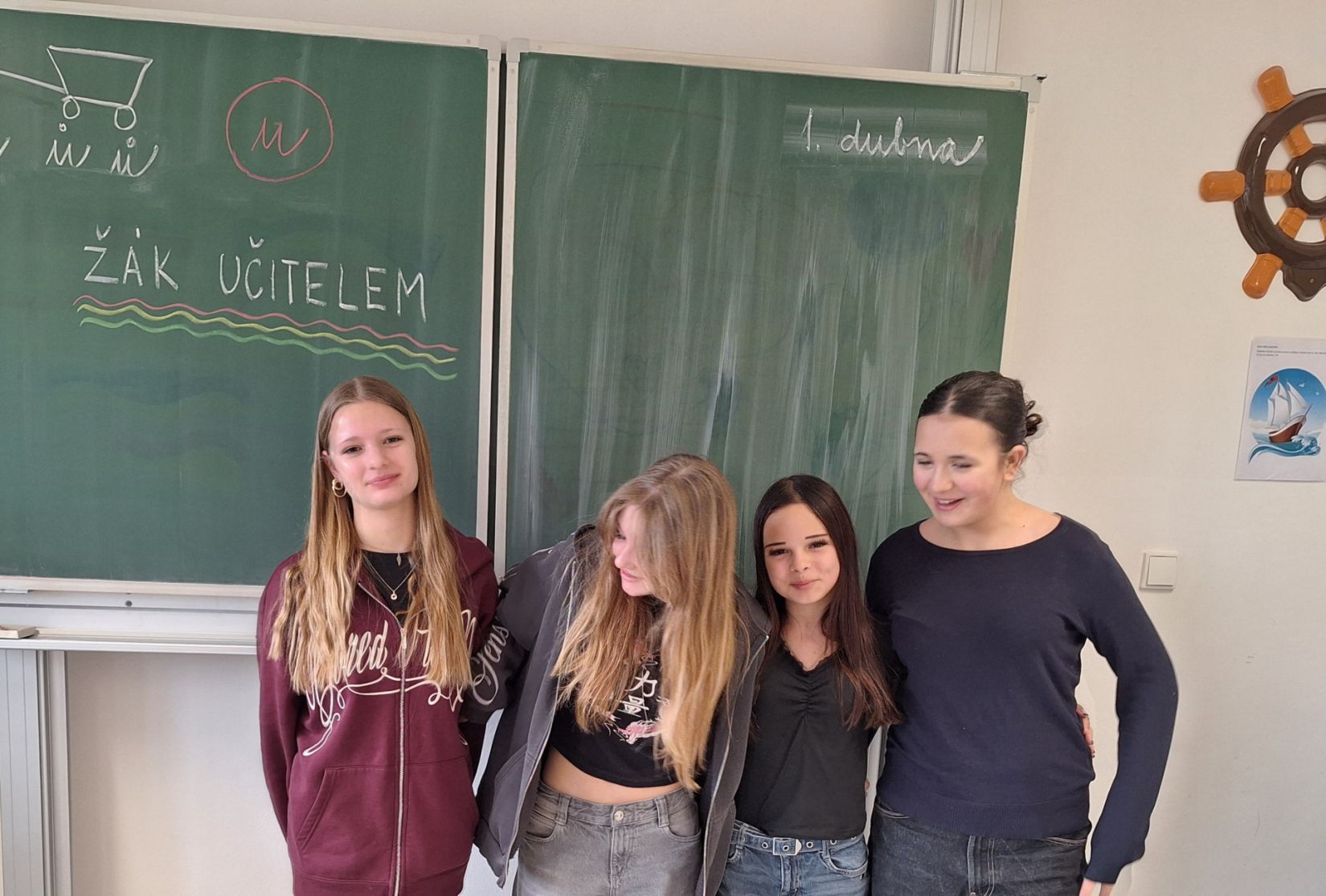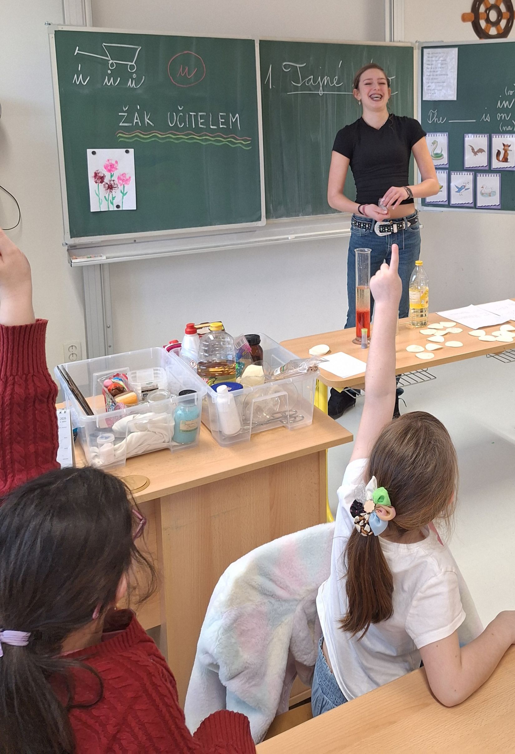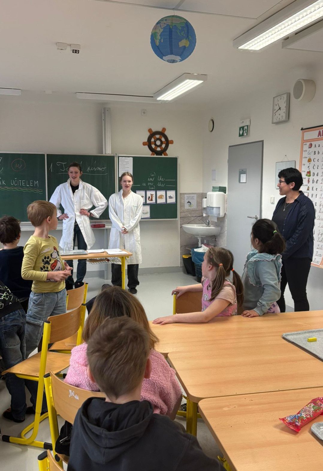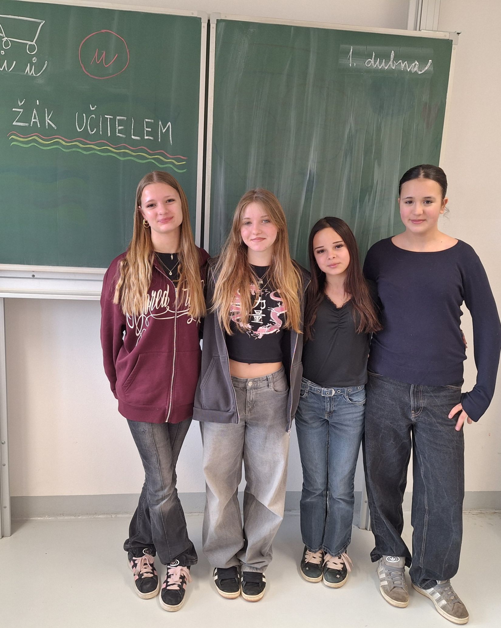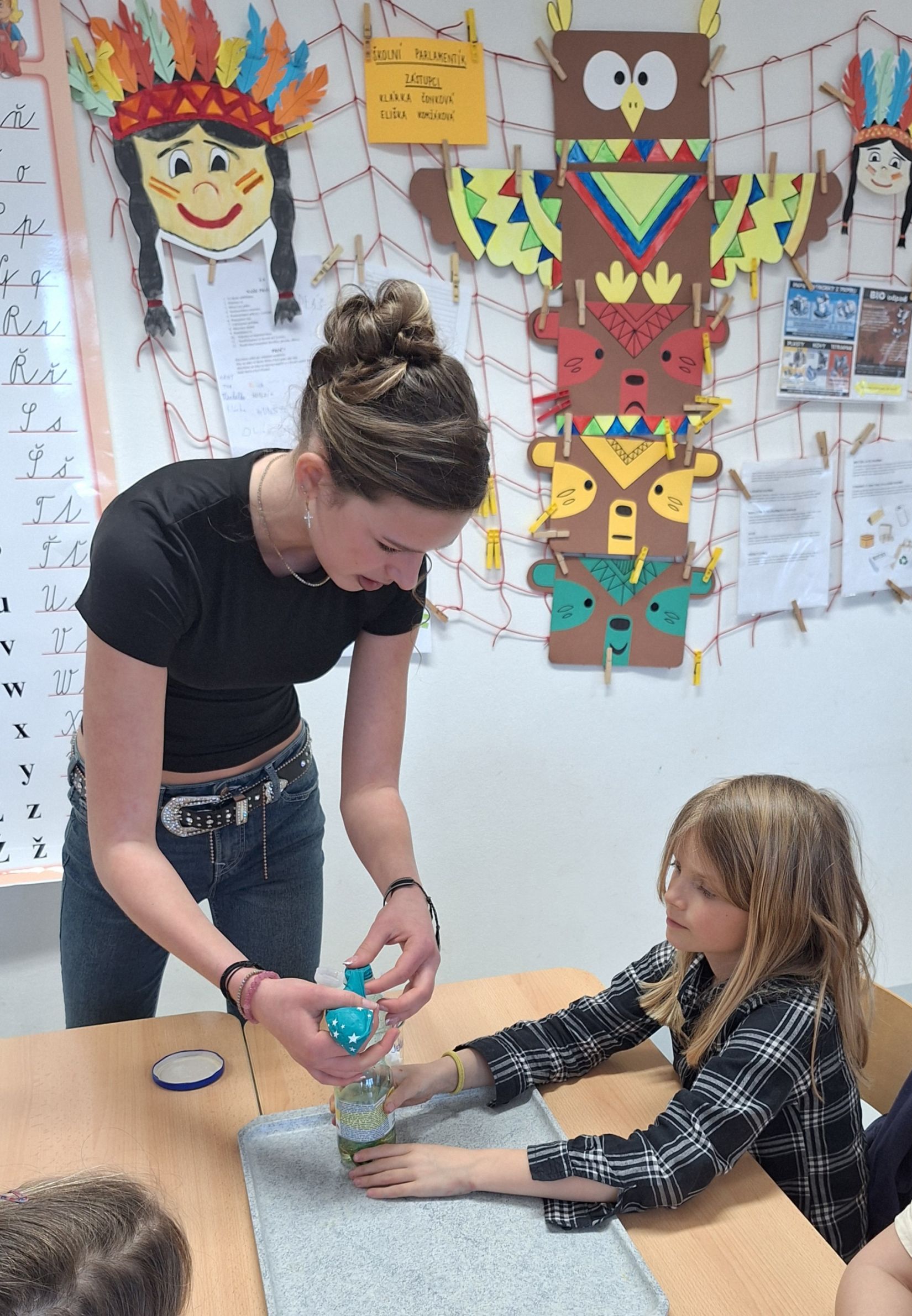 Ve středu 1. 4. 2026 se na naší škole konal projekt "Žák učitelem". V naší třídě se vystřídalo 6 milých "učitelek". První hodinu si připravily Kačka s Natálkou z 8. třídy. Byla to hodina matematiky plná her. Děti byly nadšené. Celou hodinu byly pozorné a hodné. Jedna z her se jim zalíbila natolik, že ji hrály i o přestávce. Určitě ji zařadíme i do našich hodin. Druhá hodina probíhala pod vedením Darinky a Emilky - opět žákyň z 8. třídy. Žáci pomocí otisku nastříhaných plastových brček "vykouzlili" nádherné kytice. Poslední dvě hodiny byly plné akce a napětí. Samantha a Nela z 9.A si pro nás připravily pod vedením paní zástupkyně Renaty Klimešové několik pokusů. Byly úžasné ("paní učitelky" i pokusy). Všem děvčatům moc děkujeme za skvěle připravené hodiny. Už nyní se těšíme na příští školní rok a tuto akci.