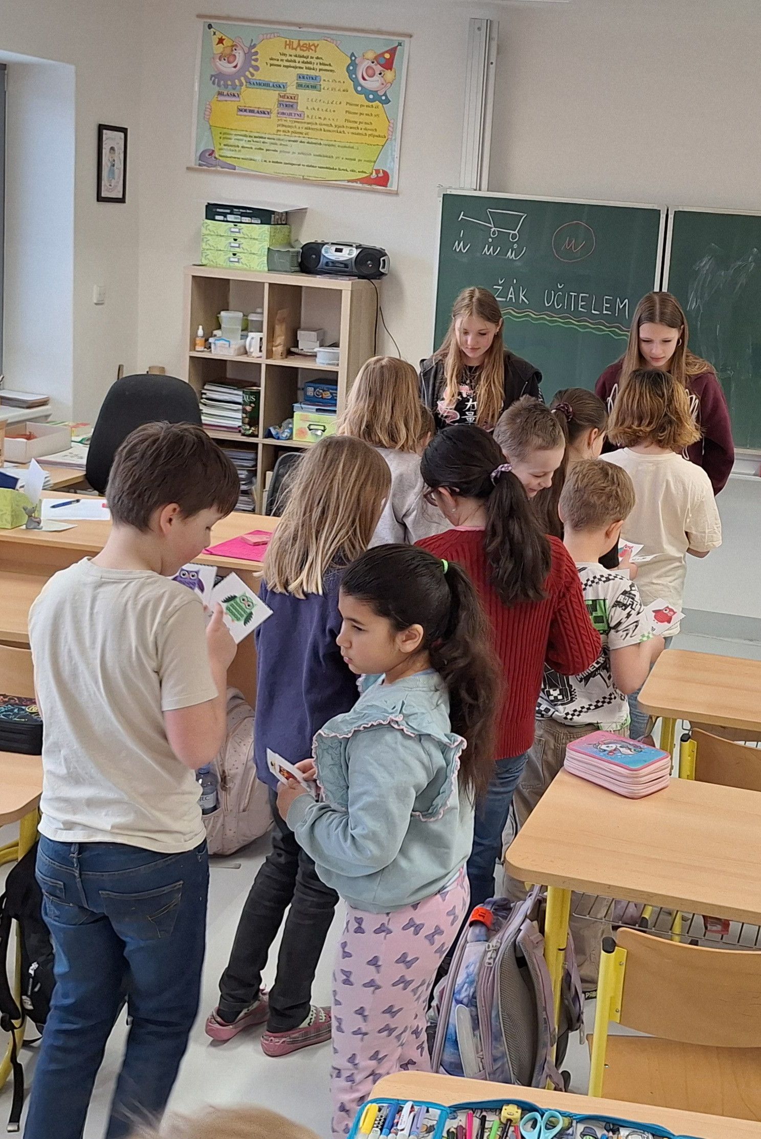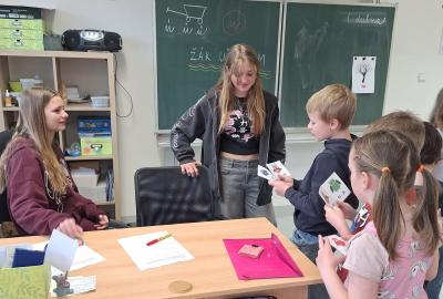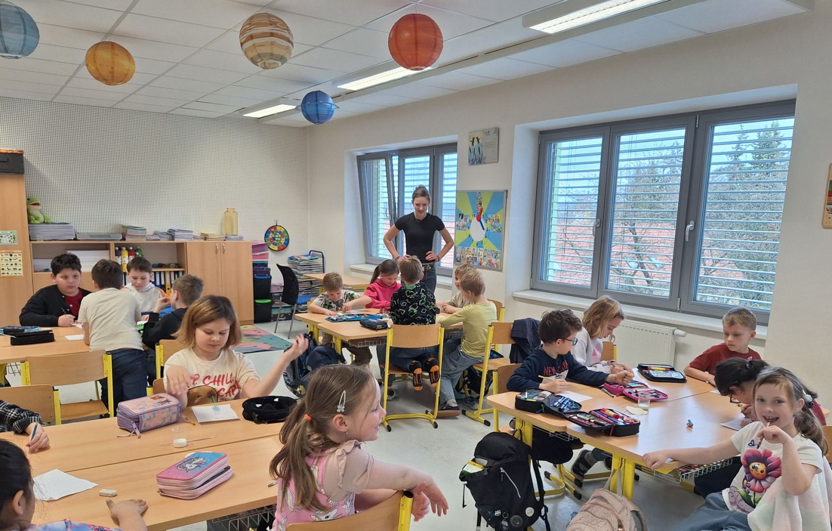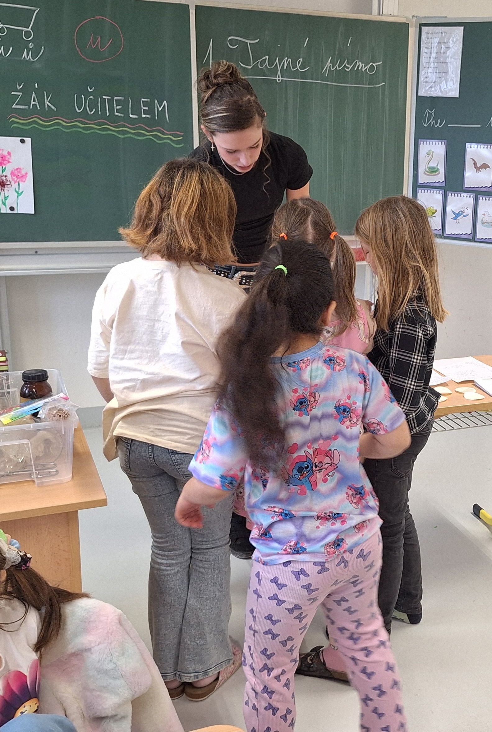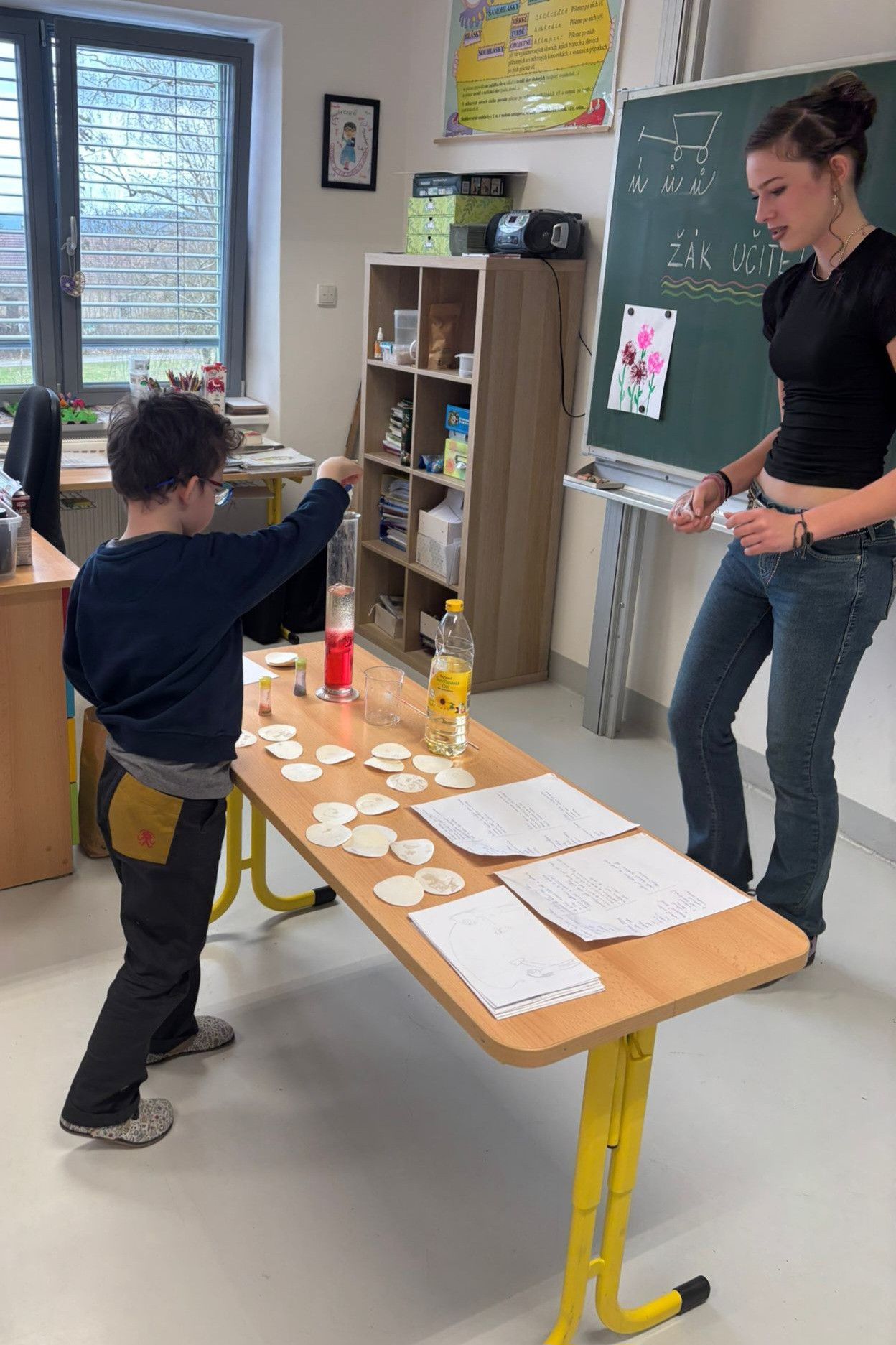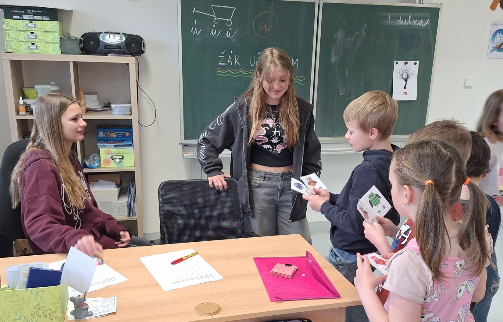 Ve středu 1. 4. 2026 se na naší škole konal projekt "Žák učitelem". V naší třídě se vystřídalo 6 milých "učitelek". První hodinu si připravily Kačka s Natálkou z 8. třídy. Byla to hodina matematiky plná her. Děti byly nadšené. Celou hodinu byly pozorné a hodné. Jedna z her se jim zalíbila natolik, že ji hrály i o přestávce. Určitě ji zařadíme i do našich hodin. Druhá hodina probíhala pod vedením Darinky a Emilky - opět žákyň z 8. třídy. Žáci pomocí otisku nastříhaných plastových brček "vykouzlili" nádherné kytice. Poslední dvě hodiny byly plné akce a napětí. Samantha a Nela z 9.A si pro nás připravily pod vedením paní zástupkyně Renaty Klimešové několik pokusů. Byly úžasné ("paní učitelky" i pokusy). Všem děvčatům moc děkujeme za skvěle připravené hodiny. Už nyní se těšíme na příští školní rok a tuto akci.