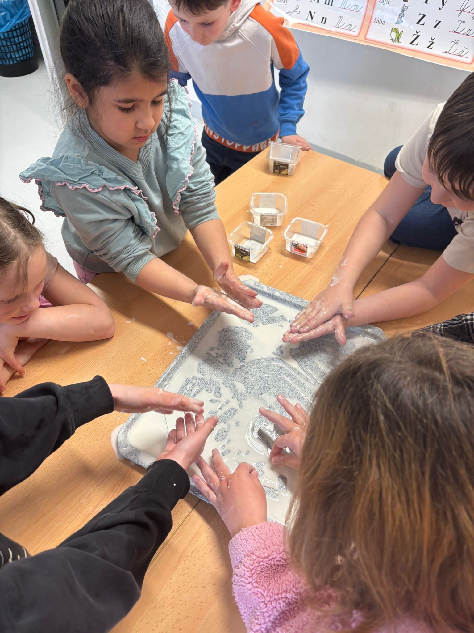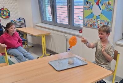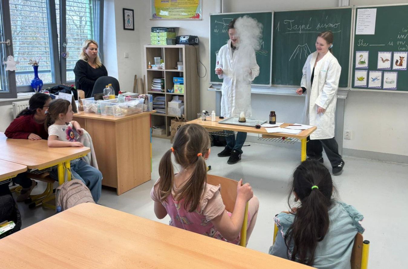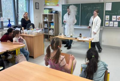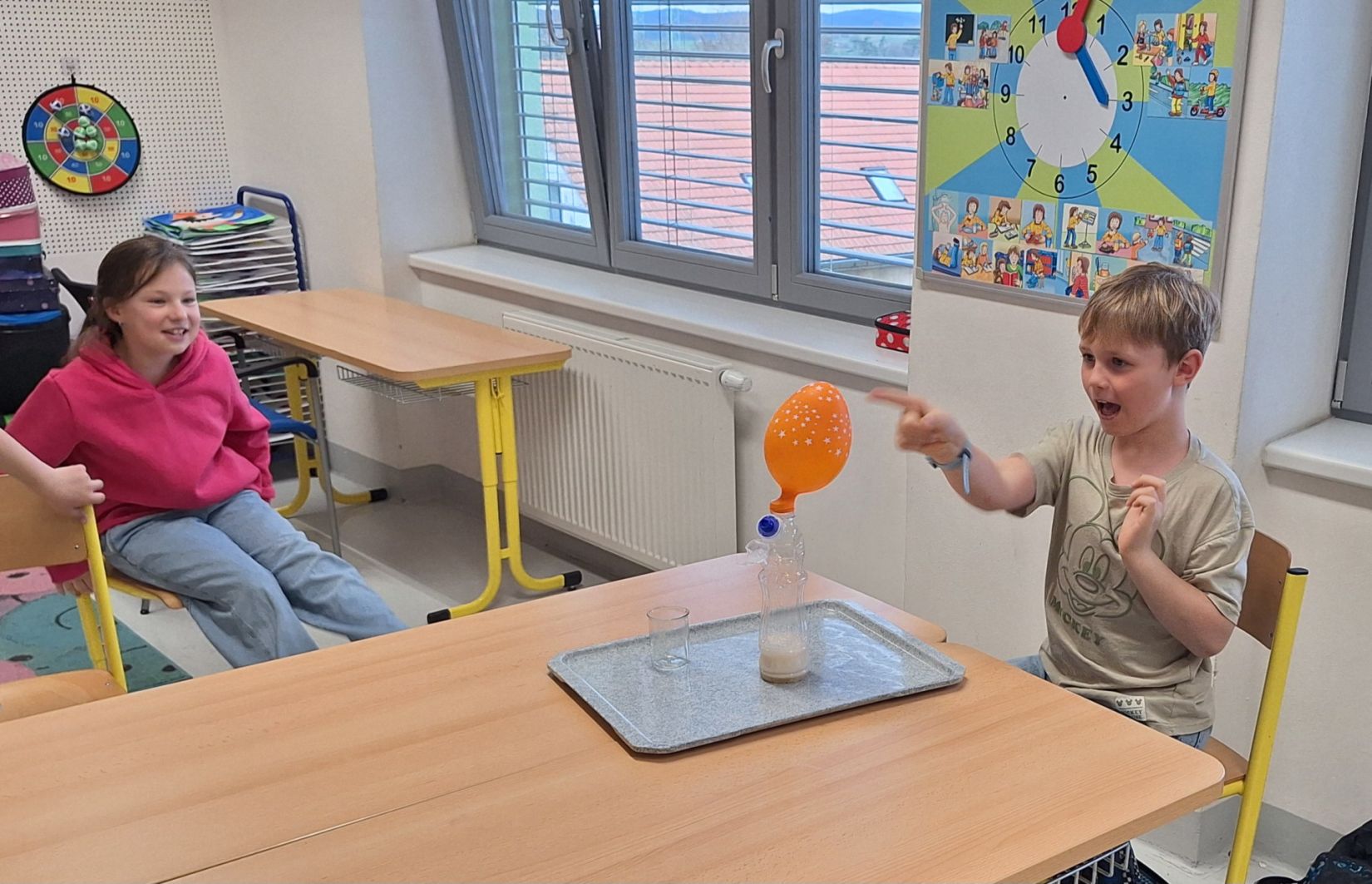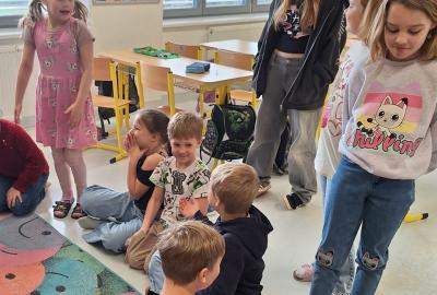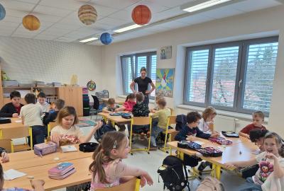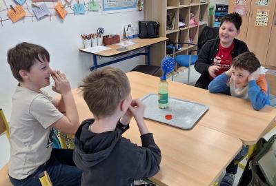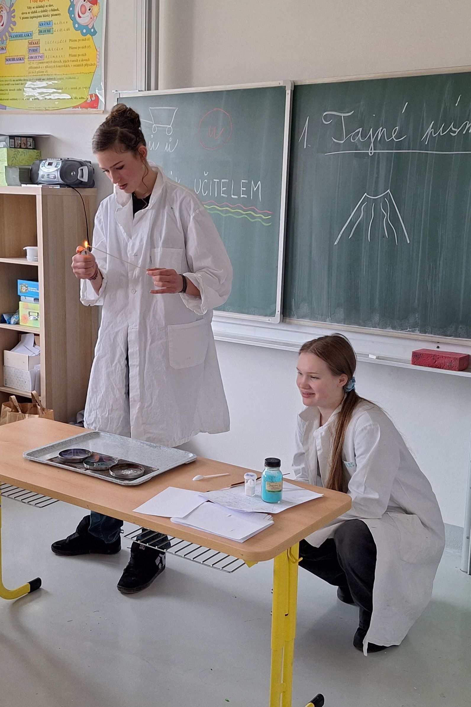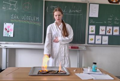 Ve středu 1. 4. 2026 se na naší škole konal projekt "Žák učitelem". V naší třídě se vystřídalo 6 milých "učitelek". První hodinu si připravily Kačka s Natálkou z 8. třídy. Byla to hodina matematiky plná her. Děti byly nadšené. Celou hodinu byly pozorné a hodné. Jedna z her se jim zalíbila natolik, že ji hrály i o přestávce. Určitě ji zařadíme i do našich hodin. Druhá hodina probíhala pod vedením Darinky a Emilky - opět žákyň z 8. třídy. Žáci pomocí otisku nastříhaných plastových brček "vykouzlili" nádherné kytice. Poslední dvě hodiny byly plné akce a napětí. Samantha a Nela z 9.A si pro nás připravily pod vedením paní zástupkyně Renaty Klimešové několik pokusů. Byly úžasné ("paní učitelky" i pokusy). Všem děvčatům moc děkujeme za skvěle připravené hodiny. Už nyní se těšíme na příští školní rok a tuto akci.