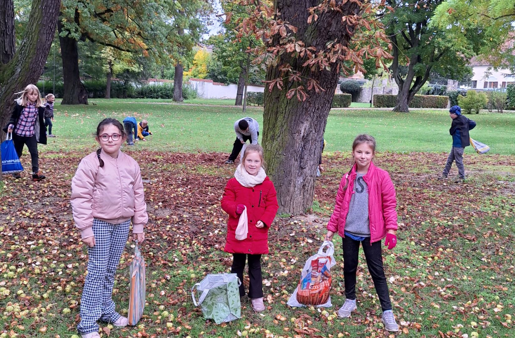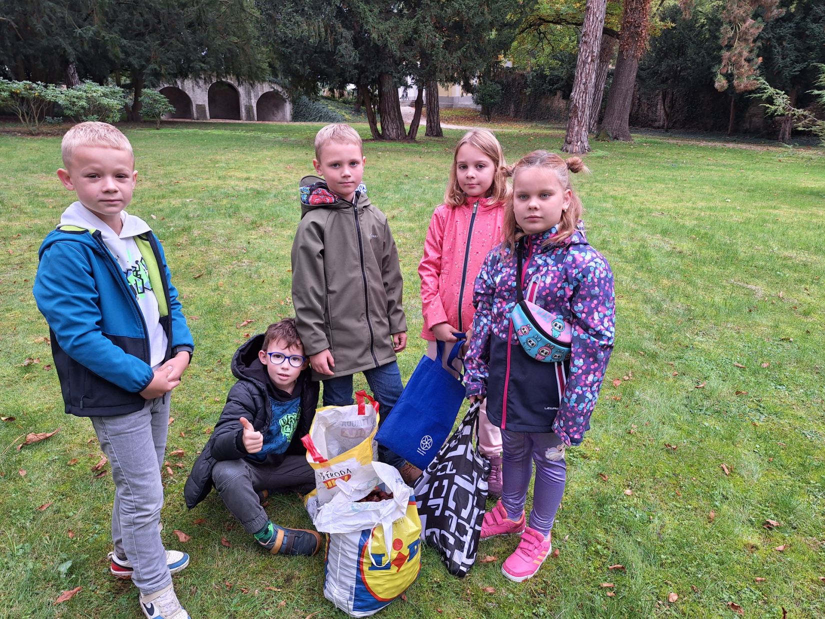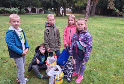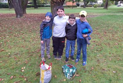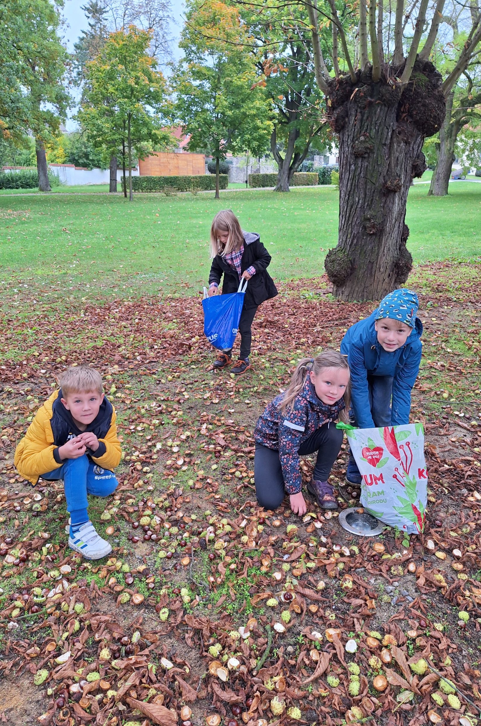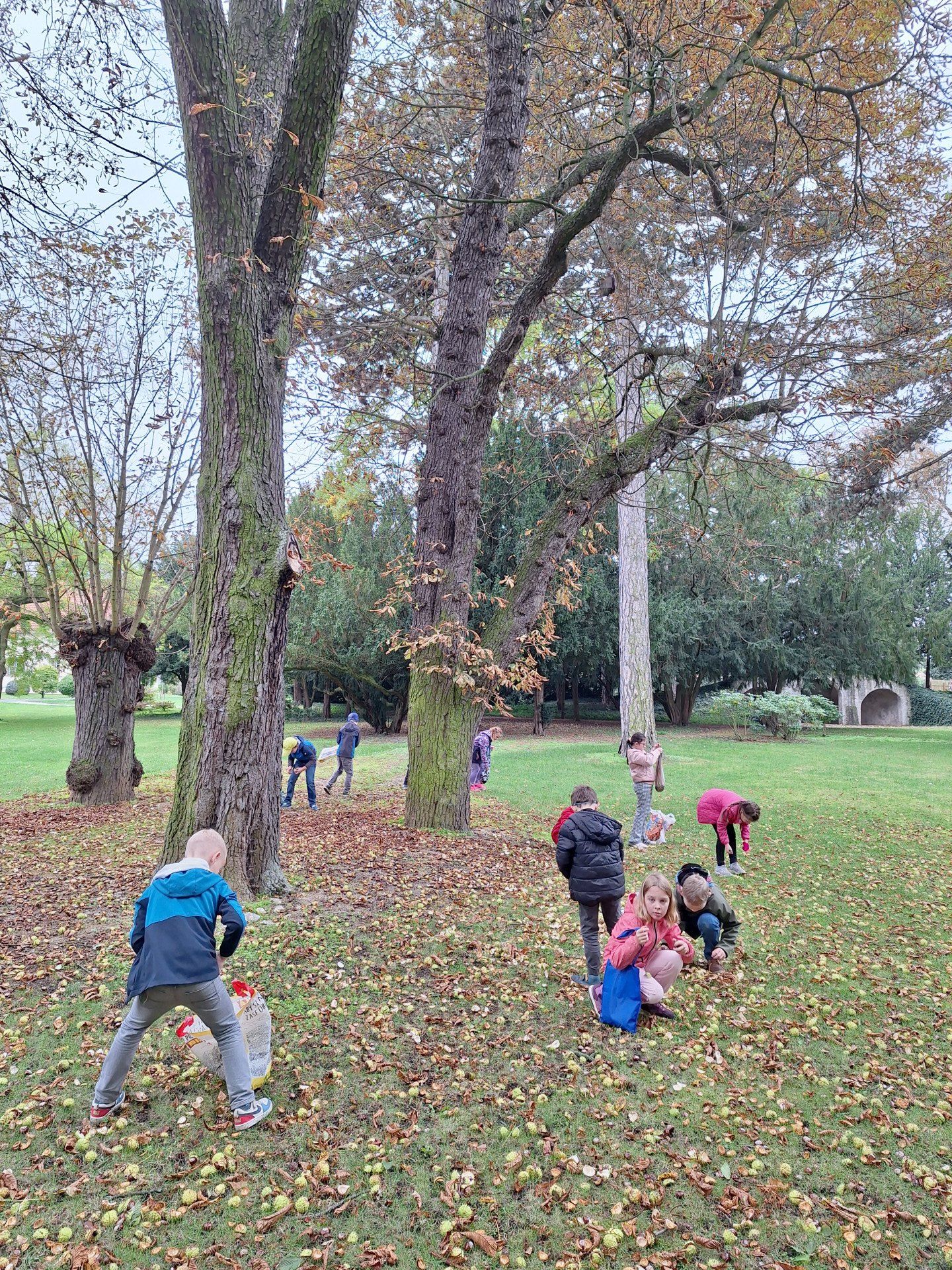 Ve středu 8. 10. jsme využili nabídky pana správce zámeckého parku a vydali se sbírat kaštany. Návštěvu areálu jsme si náležitě užili. Ukázali jsme si významné budovy - zámek, Čechovnu, oranžerii, sala terrenu, grotu. Mohli jsme nahlédnout do nově opraveného zahradního sálu a podívat se na zrestaurovanou fresku. Připomněli jsme si významné osobnosti - Jarmilu Novotnou, Svatopluka Čecha. Dále jsme se pokoušeli poznávat jehličnaté a listnaté stromy a keře. Seznámili jsme se s novými druhy. Viděli jsme tis červený nebo pavlovnii plstnatou. Některé stromy zde zasadily významné osobnosti jako např. dirigent Jiří Bělohlávek, pěvci Adam Plachetka, Dagmar Pecková nebo politik Karel Schwarzenberg. Dozvěděli jsme se tedy mnoho nového a ještě udělali prospěšnou věc. Nasbírané kaštany jsme následující den odnesli do obory jelenům a daňkům.