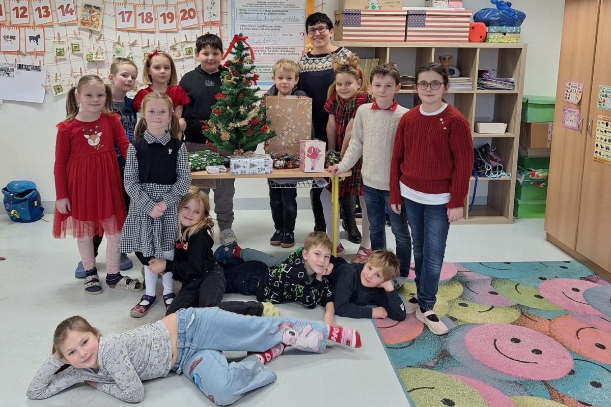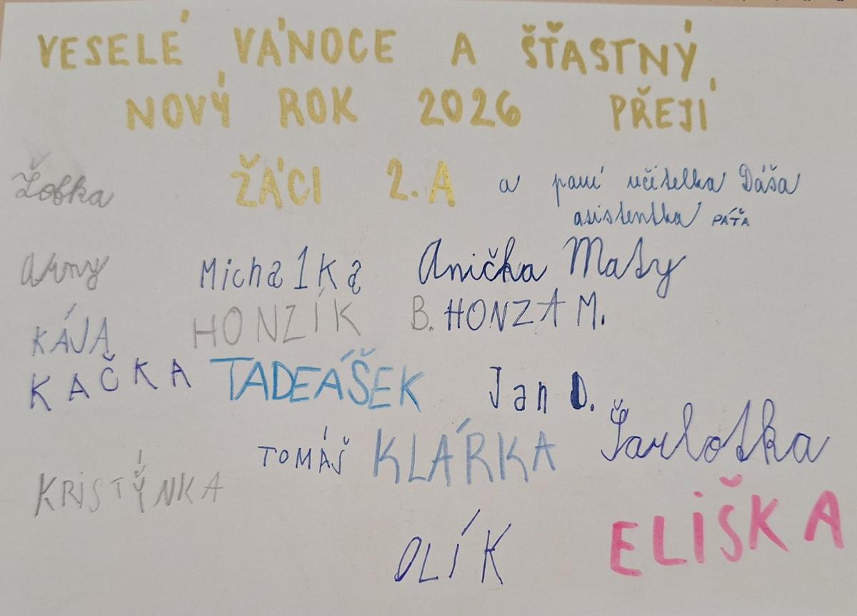 Veselé Vánoce a hodně štěstí, zdraví, lásky a pohody v novém roce 2026 přejí žáci 2.A, paní učitelka Dáša a asistentka pedagoga Patrika