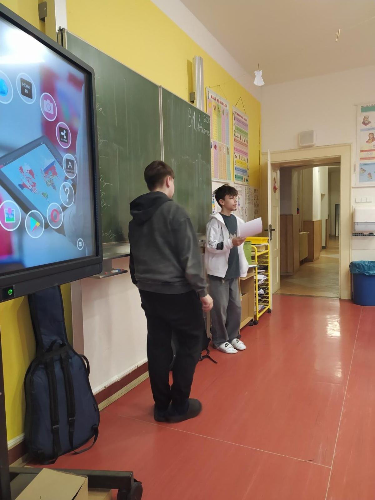 Dnes ráno k nám přišli žáci z vyšších ročníků vyučovat. U nás byli kluci ze 7. ročníku. Musím říct, že velice slušně a s předstihem se přišli domluvit na hodinu Českého jazyka. Zjistili si, co se vyučuje a přišli včas a připraveni s pracovními listy a soutěžemi do hodiny. Děti zvládly i skupinovou práci.