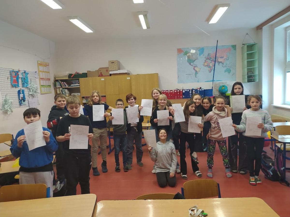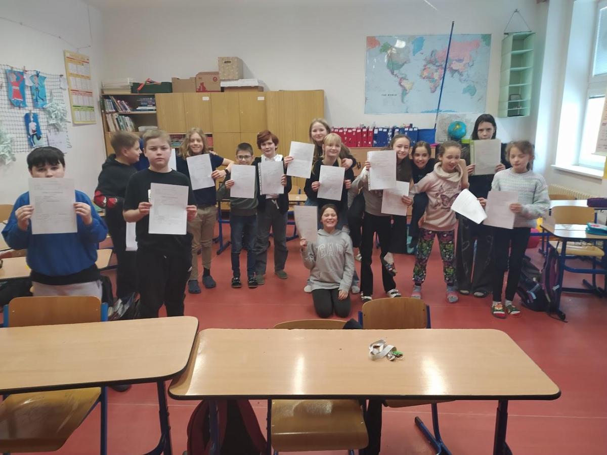 Dnes si děti napsaly svá vysvědčení, kde se mohly vyjádřit k tomu, co jim jde, kde naopak v něčem musí přidat. V anglickém jazyce třeba všichni píší, že by se měli doučit časy. Cítí se dobře v Matematice, v Přírodovědě, ve Vlastivědě. Čtení všichni cítí, že by měli přidat. V Hudební výchově velice často zaznívá, že je třeba se naučit noty.